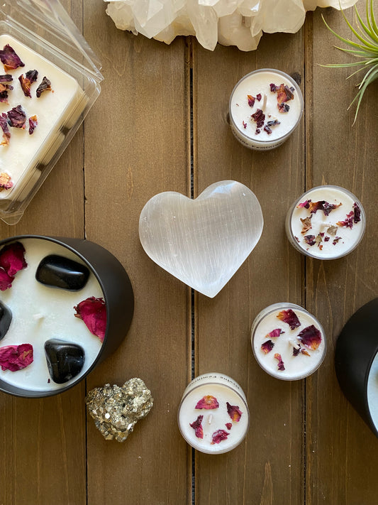Each candle is infused with powerful crystals to enhance intention and manifestation: