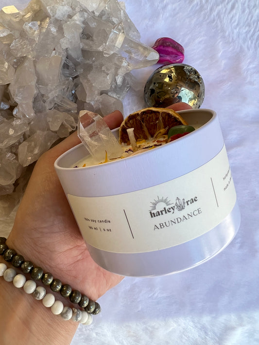 Invite prosperity, success, and positive energy into your space with the Abundance Candle by HarleyRae. Hand-poured with organic, non-toxic wax and infused with carefully selected crystals, this luxurious candle is designed to elevate your vibrations and align you with the energy of wealth, opportunity, and manifestation.