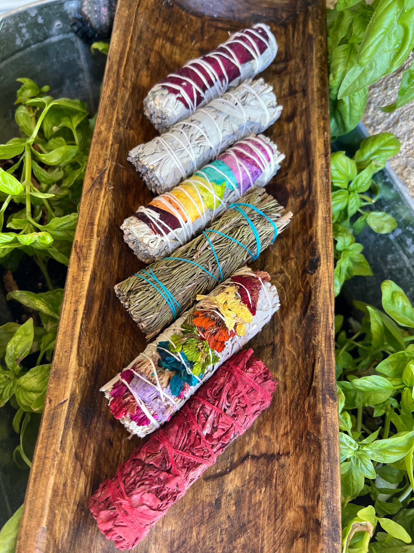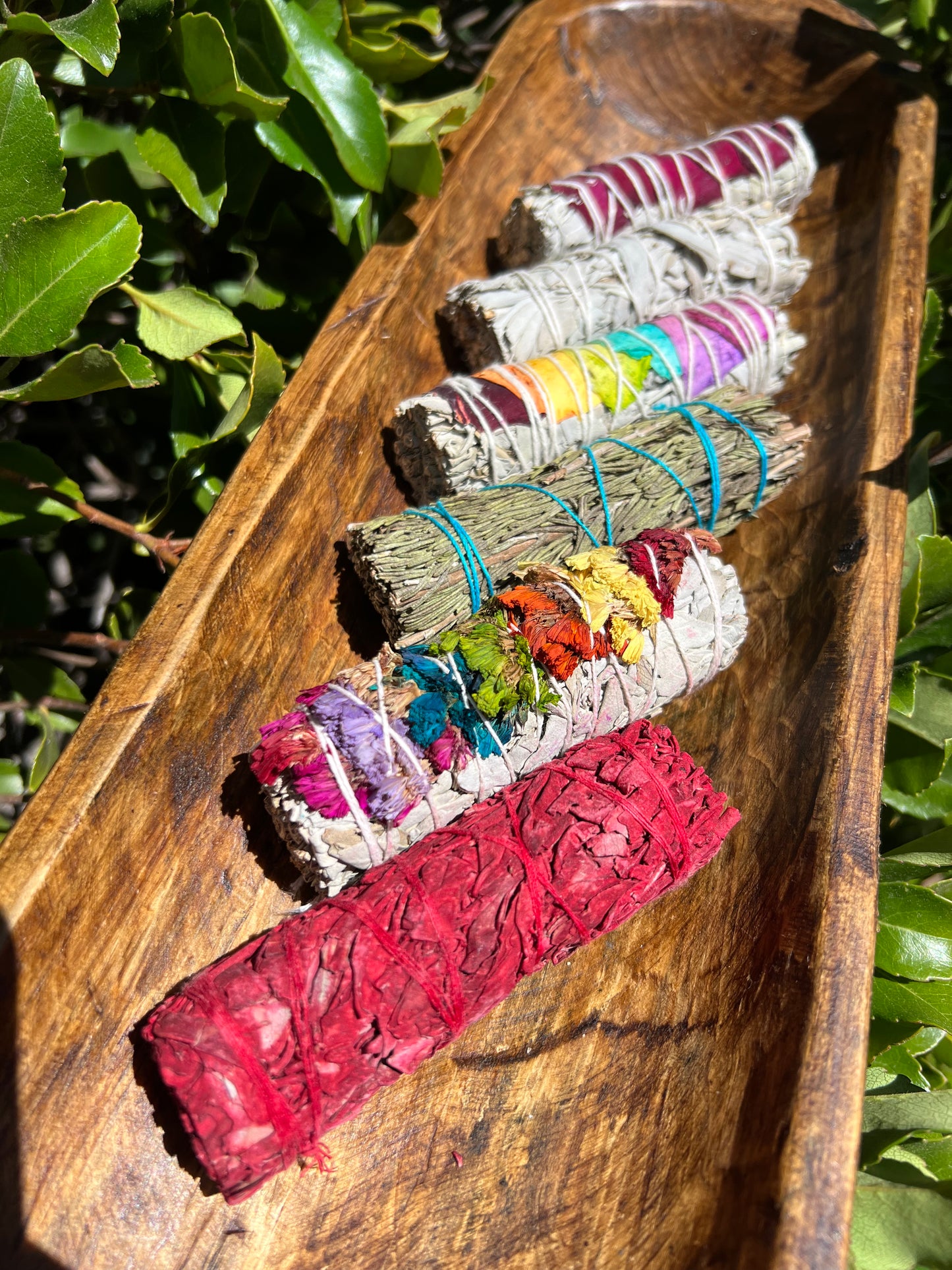 7 Chakra White Sage with Sinuata Flowers: This special sage stick features white sage combined with a rainbow of sinuata flowers, each representing one of the seven chakras, to promote holistic healing and spiritual alignment.